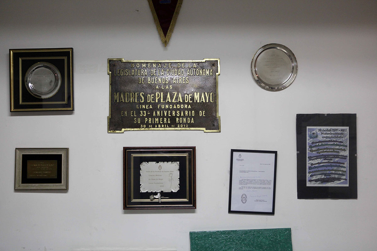 Minutos antes de las 15, el timbre comienza a sonar. Son las integrantes de línea fundadora. Algunas llegan solas, algunas visten sus pañuelos, muchas se sostienen sobre sus andadores o bastones. La mesa va creciendo: Haydée Gastelu, Laura Conte y Vera Jarach. Más tarde, se irán sumando otras mujeres. Haydée cuenta que tuvo la “fortuna” de recuperar los restos de su hijo, Horacio Oscar García Casteló, hace algunos años. Y que “el amor de madre” la llevó a la Plaza, por impulso de Azucena.