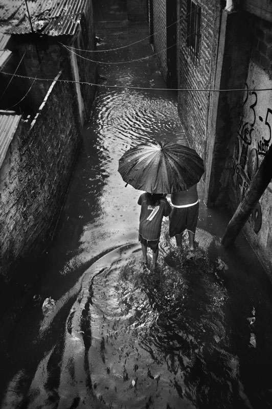 Habrá sido por el rollo número doce cuando tomé una foto que me hizo entender todo. Era un día de tormenta y los pasillos de la villa se inundaban. Las madres, poco más preocupadas que nosotros, corrían bajo la lluvia para comprar algo en el almacén de Don Chávez. Yo estaba parado en el patio del primer piso de La Casa de la Abuela, que a la vez funcionaba como balcón y daba a un pasillo inundado que se extendía hasta desaparecer. Parado ahí, casi inmóvil, miraba el agua y comparaba esa imagen con las tormentas de recordaba de niño en Moreno cuando nos aventurábamos con los pibes del barrio a bañarnos en lo grandes agujeros de la calle de tierra de la esquina de casa.