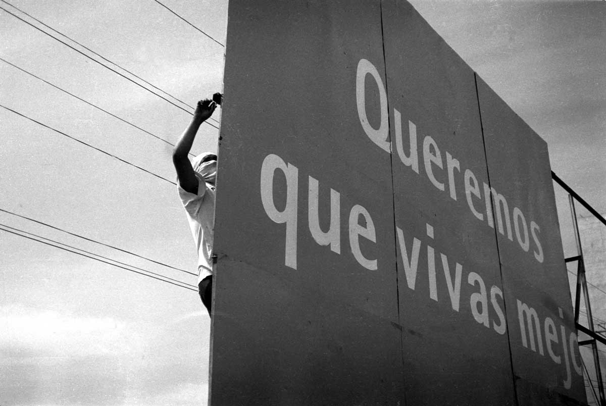 «Queremos que vivas mejor». El cartel publicitario de una aseguradora será utilizado por los piqueteros para el corte de ruta. Los piquetes son mal vistos por la población, Los desocupados, sin embargo, no tienen otra manera de hacerse escuchar.