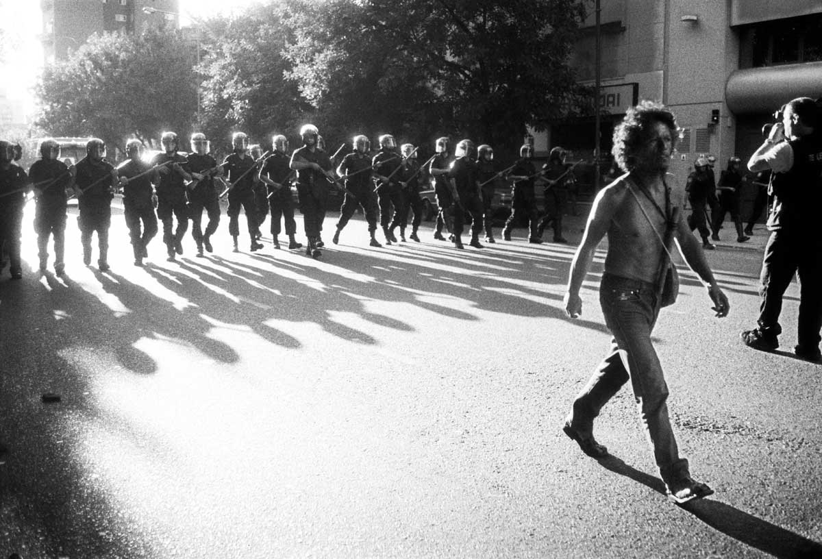 Desalojo del Padelai, en Buenos Aires, barrio de San Telmo. Marcial, músico del Movimiento de Trabajadores Desocupados, aminora la marcha para que las mujeres y los niños se puedan dispersar.