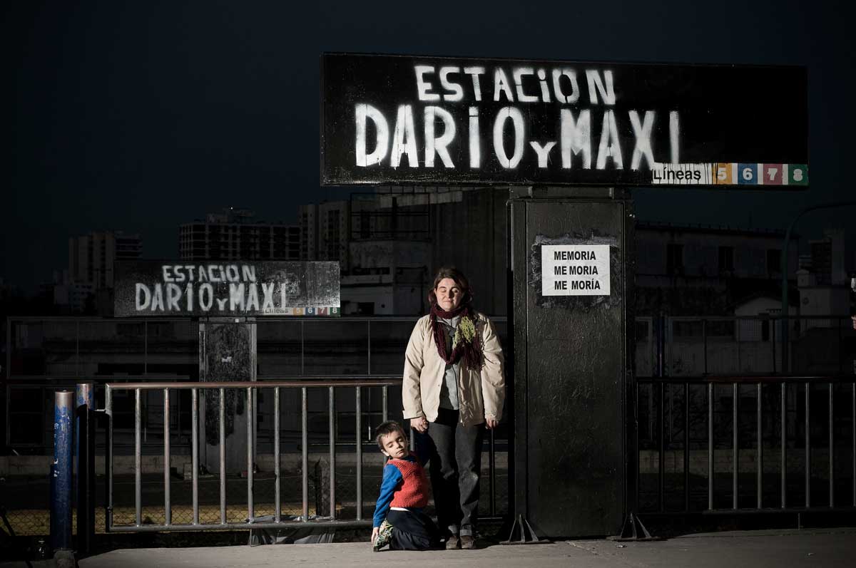 Darío y Maximiliano Kosteki participaron en la marcha piquetera del 26 de junio de 2002, cuando fueron exterminados en el marco de una gran represión con decenas de heridos de bala y cientos de detenidos. La militancia, la capacidad organizativa -dejó en marcha varios emprendimientos productivos- y luego su sacrificio, convirtieron a Darío en un símbolo político y en estampa popular, como ejemplo de dignidad y lealtad. Una biblioteca, una calle y la misma estación de tren llevan los nombres de los jóvenes. Hay murales, camisetas, máscaras y pancartas con sus rostros. Algunas personas, como lo ejemplifica el retrato de Mabel, lo convirtieron en objeto de su devoción, poniendo su fe en él y levantando sucesivos altares en plena estación ferroviaria donde cada 26 es día de ofrenda y oración.