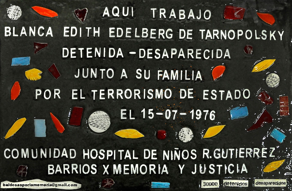 “Es muy fuerte hacer la baldosa, ir colocando las letras, construirla. La fuimos haciendo de a poco, con mucha obsesión para que las letras quedaran perfectamente alineadas”, dice Daniel Tarnopolsky, único sobreviviente de una familia diezmada el 15 de julio de 1976. Este 7 de julio su madre Blanca Edelberg hubiera cumplido 89 años y ahora su nombre descansa en forma de huella a la entrada del Hospital de Niños Ricardo Gutierrez, donde trabajó.