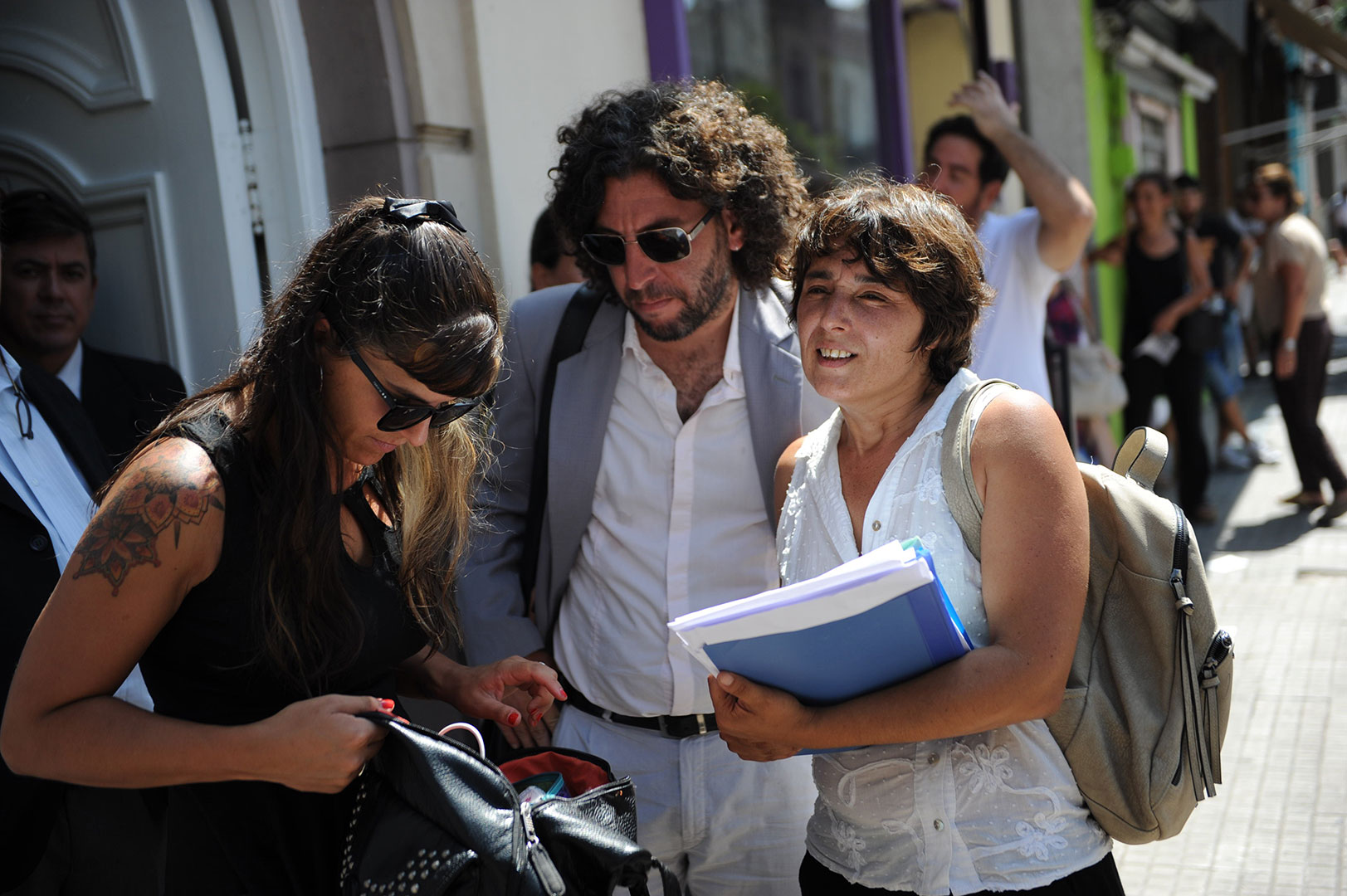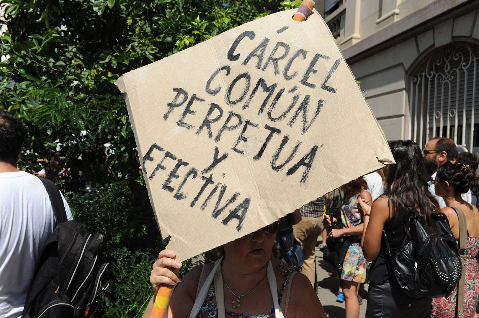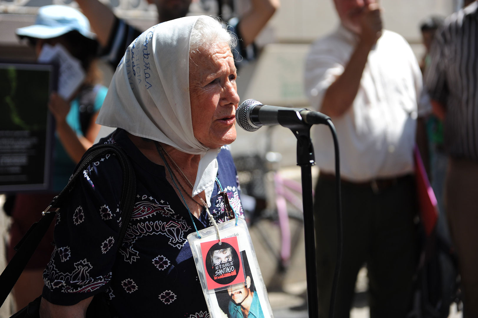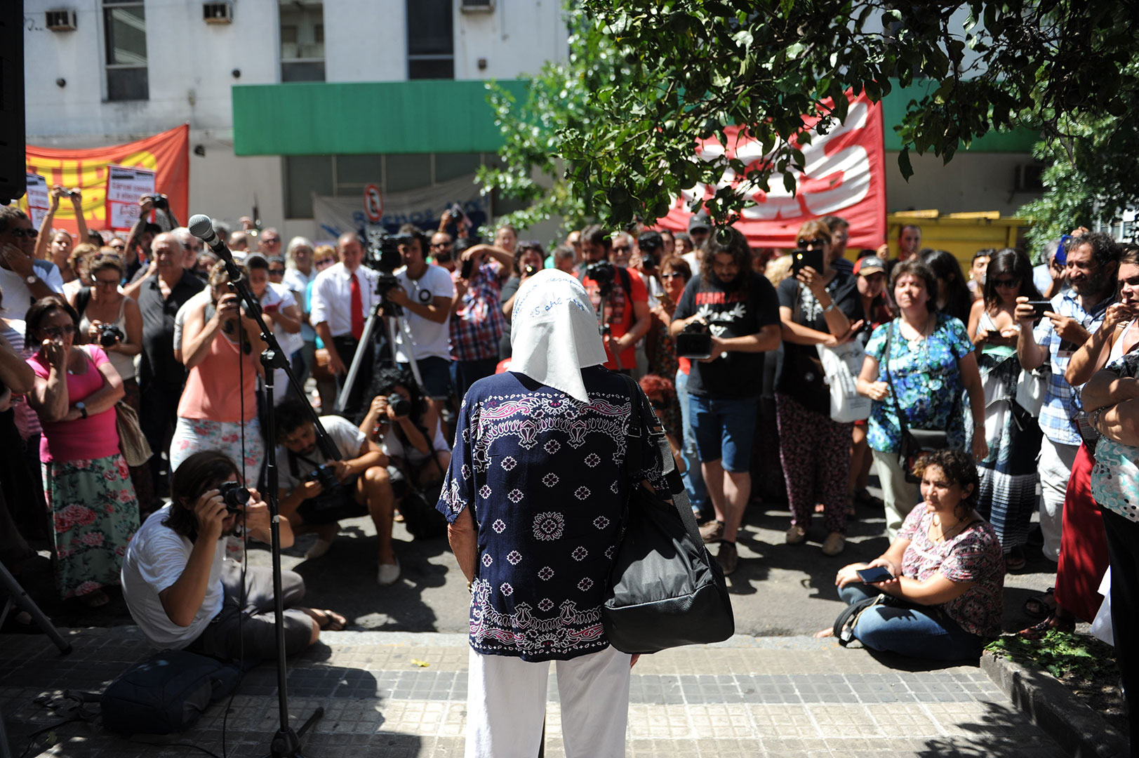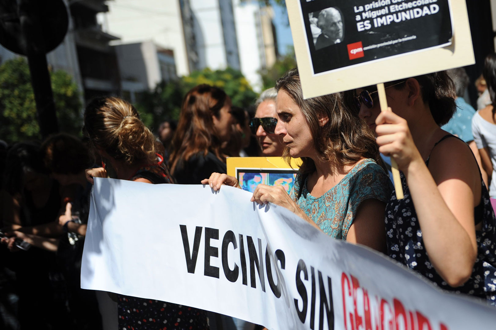 Acto en los Tribunales de la Plata para pedir la revocatoria de la prisión domiciliaria a Etchecolatz