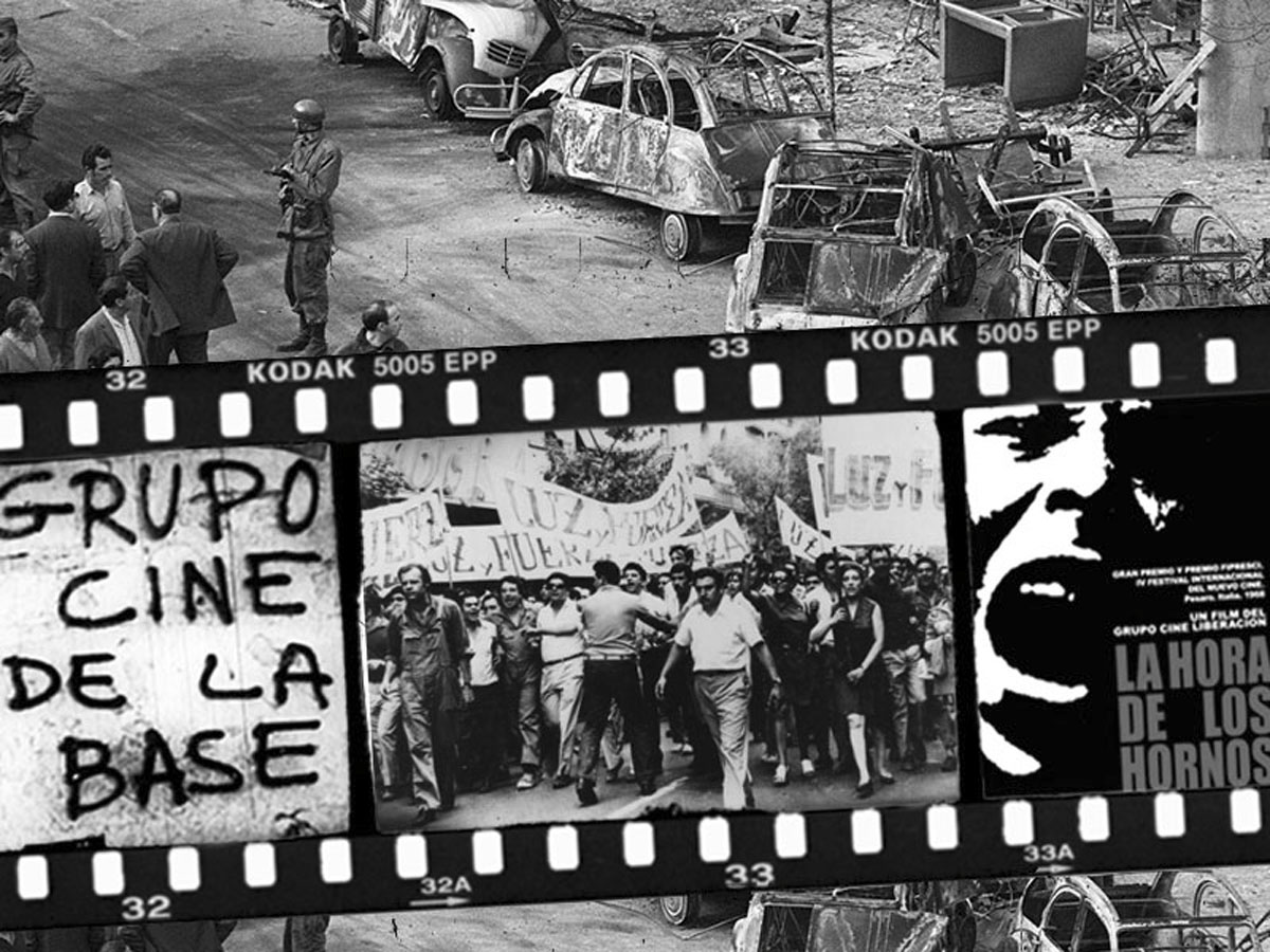 Imágenes del cordobazo y afiche de la película "La hora de los hornos", film argentino realizado en 1968 por los cineastas Fernando "Pino" Solanas y Octavio Getino