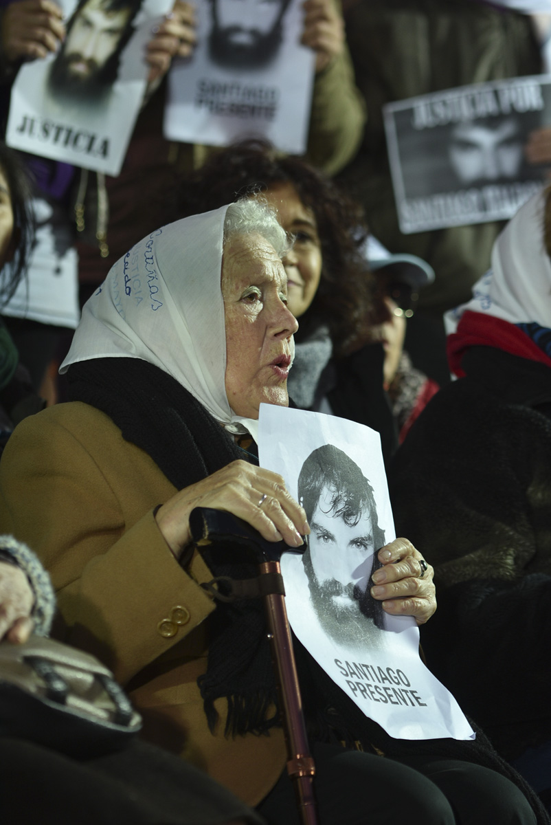 Pocos meses después de la plaza en rechazo del 2 por 1, se produjo la desaparición de Santiago Maldonado. Este caso, sobre todo luego de ser encontrado el cuerpo de Santiago, fue utilizado por el gobierno como una advertencia a los organismos de derechos humanos y un acto de escarmiento colectivo por lo que oficialmente se consideró como un movimiento de denuncia y movilización “excesivo”. Así, resultaron primero amonestadas las comunidades machupes, luego los familiares de la víctima, más tarde los organismos que acompañaron el reclamo de aparición con vida, y finalmente la sociedad en su conjunto que masivamente se plegó a la pregunta sobre su paradero y la exigencia de búsqueda. Una vez hallado el cuerpo de Santiago y en el marco del proceso electoral de medio término, el gobierno confrontó a los organismos como opositores políticos. Fue un punto de quiebre.