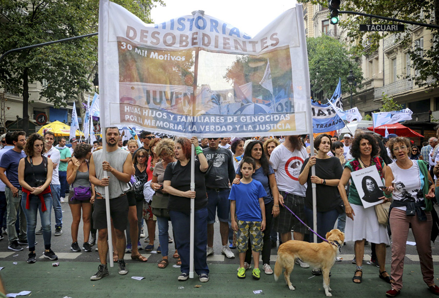 Con diferencias y disidencias, con momentos de apertura de la voz y otros de silencio, a través de encuentros, de una página web y de las redes sociales, el colectivo se fue consolidando y animándose a la aparición pública. Y cuando digo aparición me refiero una vez más a esa performatividad de los cuerpos que singulariza la experiencia argentina: marchar, con una reivindicación y también bajo una bandera, la del colectivo, que salió a la luz por primera vez en la gran marcha feminista Ni una menos, en junio de 2017, generando eco en algunos medios, y más tarde se unió a la clásica conmemoración del 24 de marzo de 2018. Un momento crucial en el recuerdo compartido: la vergüenza, la angustia, el miedo al rechazo, a no ser aceptados en la lengua común, a ser puestos a distancia insalvable de las víctimas. Las víctimas de sus padres.
