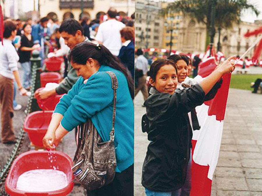 El Colectivo Sociedad Civil convocó abiertamente a los estudiantes de arte, los militantes de organizaciones resistentes y los familiares de tantas víctimas, entre otros, a traer banderas peruanas manchadas de rojo para lavarlas con jabones y tablas de lavar en las fuentes de Lima. La acción urgente contra la corrupción de Fujimori Lava la bandera fue realizada por primera vez el 20 y 21 de mayo de 2000 en el céntrico Campo de Marte de la ciudad de Lima. El 24 del mismo mes, a cuatro días de la segunda vuelta electoral, el Colectivo trasladó la acción a la Plaza Mayor, y repitió la operación todos los viernes –a pesar de varios actos de represión por parte del gobierno- en la pileta colonial de ese emblemático espacio. La acción fue socializada hasta incorporarse como imagen natural ante la necesidad de lavar la bandera. Una particularidad de esta como de otras realizaciones equivalentes de ese período, fue que nació pensada en el seno de un grupo, pero fue llevada a quienes luchaban por determinados objetivos-lo que se confirma con la participación que registran las fotos-, sin preservar la identidad artística ni el derecho de autoría, para convertirse en herramienta de lucha que otros pudieran retomar.