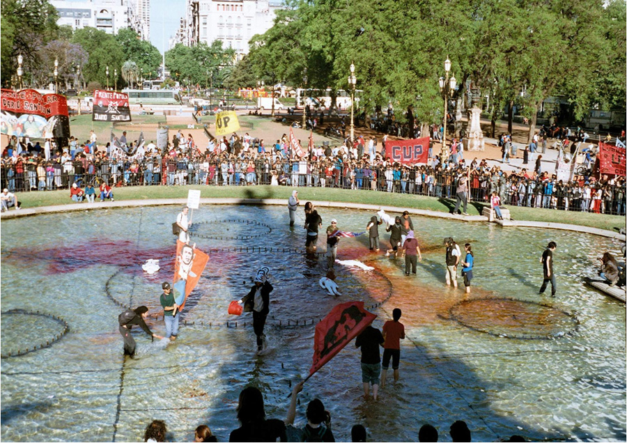 El sábado 18 de enero de 2020 en Buenos Aires aparecieron teñidas de rojo dos de las fuentes de Plaza de Mayo, acción supuestamente realizada por los organizadores del acto por el quinto aniversario de la muerte del fiscal Nisman. Julio Flores repasa la historia de algunas de las prácticas artísticas de activismo político-cultural de los últimos tiempos y las compara con la acción realizada hace una semana en Plaza de Mayo.