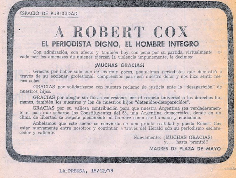 En ese contexto de masivo silencio, ocultamientos y/o complicidades encontramos una notable excepción: la experiencia del Buenos Aires Herald (diario de la comunidad inglesa, fundado en 1876) y la de su director Robert Cox, de ideología liberal (en el uso y sentido más estricto del término: capitalista, antipopulista, anticomunista pero ferviente defensor de las libertades individuales y de los derechos humanos), quien, cuando prácticamente nadie se atrevía a publicar información sobre secuestros y desapariciones forzadas de personas, denunció de manera persistente las violaciones a los derechos humanos que se estaban llevando a cabo en nuestro país.