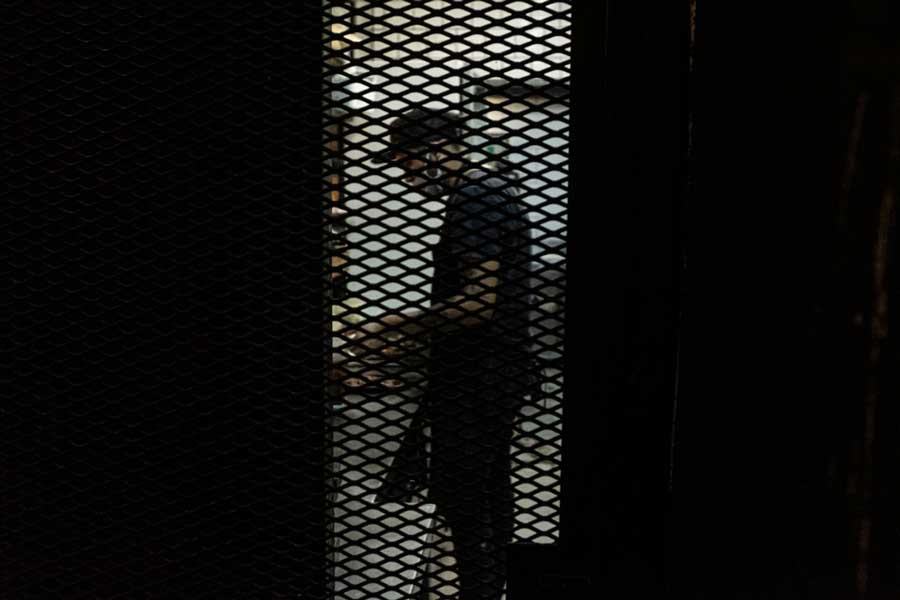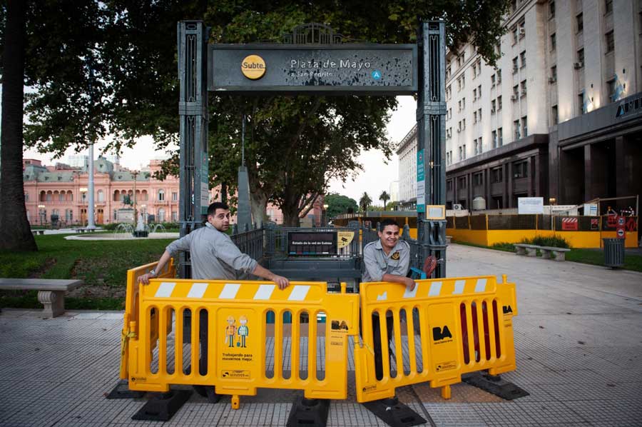 En el inicio de la cuarentena y en una desierta Plaza de Mayo, trabajadores de la línea A de subte cuidan el ingreso a la estación que se encuentra en obra.