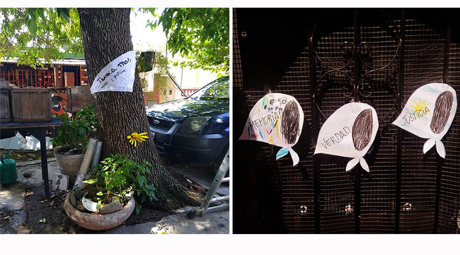 Pañuelo blanco con la consigna Nunca Más. Verdad y Justicia frente a la casa de Liliana Rojas en Barrio Mitre, CABA/ Pañuelos de las madres que recuerdan Memoria, Verdad y Justicia en la ventana de la casa de Brunella Lozer Florida, Vicente López 24 de marzo 2020.