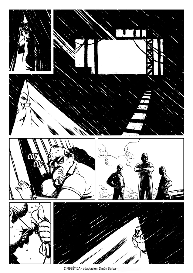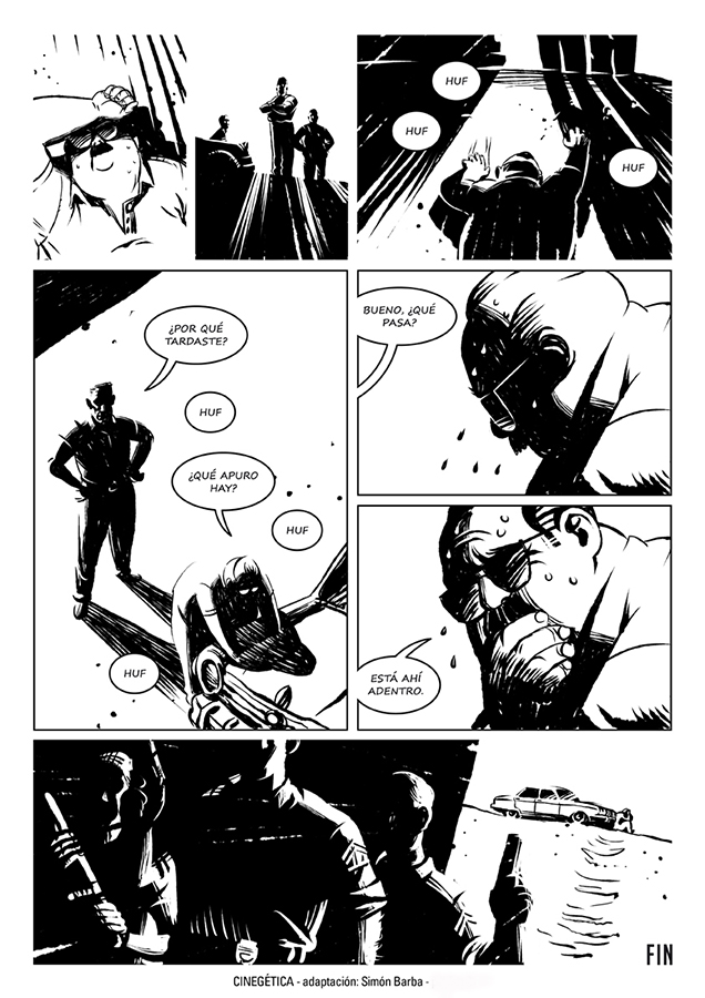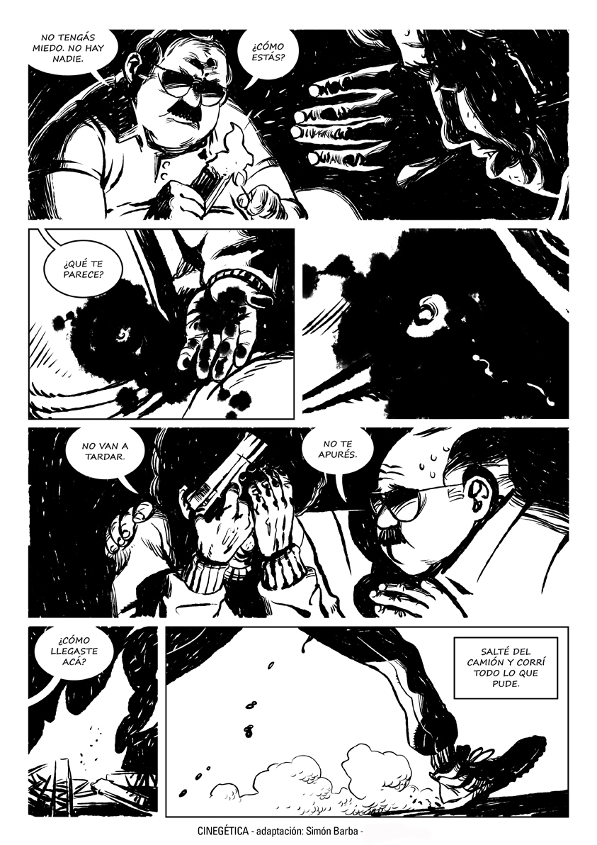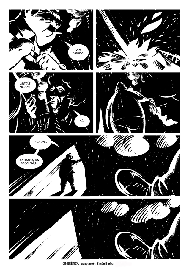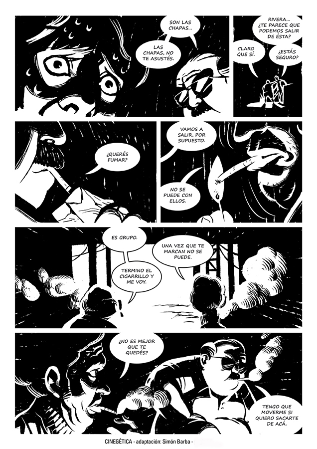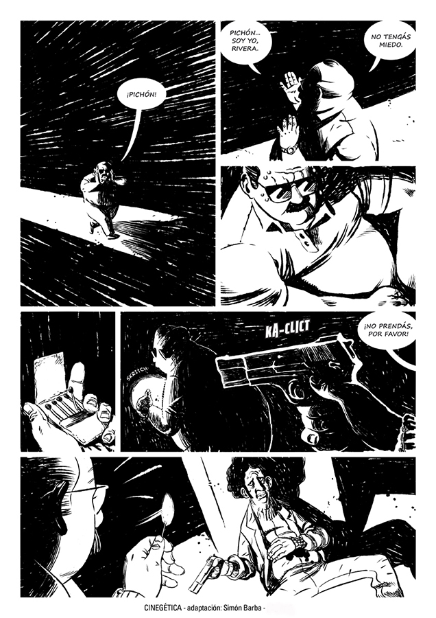 “Me asombró la relación clima/espacio que se da en esta historia. Por eso, llevado al lenguaje de la historieta, separé la narración en dos espacios bien definidos por la iluminación, un adentro lleno de sombras y un afuera donde no hay lugar para esconderse”.