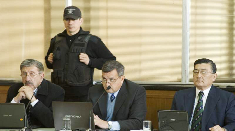Carlos Eduardo Carrizo Salvadores, Lucio Montero (defensor) y Mario Nakagama ante el Tribunal Oral Federal en lo Criminal, compuesto por los jueces Juan Carlos Reynaga, Carlos Jiménez Montilla y Gabriel Casas. Fuente: https://www.elancasti.com.ar