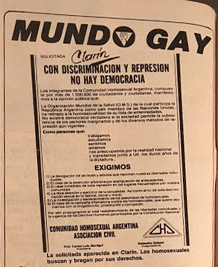 Jáuregui, con su grupo íntimo, les hizo comprender la necesidad de reclamar en conjunto una ley antidiscriminatoria que contuviese el criterio de orientación sexual. O sea, que, en esa primera época de articulación, los organismos de derechos humanos reconocieron como discurso el libre ejercicio de la sexualidad. La CHA fue creada bajo la impronta de la defensa de los derechos humanos y como parte integrante de un proceso mayor de luchas sociales y políticas. “Con discriminación y represión no hay democracia” era el título de una solicitada de dicha asociación publicada en mayo de 1984 en el diario Clarín. Con ese enunciado, la sociedad quedaba notificada de la existencia de una organización civil, que reclamaba demandas imprescindibles para la propia existencia.