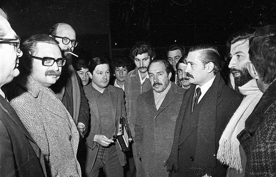Integrantes de la Asociación Gremial de Abogados de Buenos Aires llegan a Trelew tras la fuga del Penal de Rawson y realizan una conferencia de prensa afuera del estudio de Mario Abel Amaya y David Patricio Romero. De izquierda a derecha, Pedro Galin, Miguel Angel Radrizzani Goni, Rodolfo Ortega Peña, con micrófono en la mano el periodista de JORNADA Hugo Hernando, los de atrás S.i., Carlos Gonzales Gartland, Eduardo Luis Duhalde y Rodolfo Mattarollo. Los demás S.i. 18 de Agosto de 1972. Provincia del Chubut, Ciudad de Trelew. Afuera del estudio de Mario Abel Amaya y David Patricio Romero.