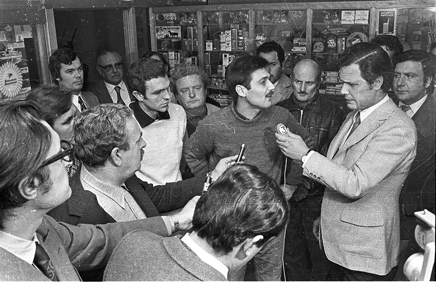Los tres sobrevivientes de la Masacre de Trelew ofrecen una conferencia de prensa. De izquierda a derecha, con bigotes y lentes oscuros Ricardo Rene Haidar, Maria Antonia Berger y Alberto Miguel Camps. Los demás S.i. 5 de agosto de 1973. Provincia del Chubut, Ciudad de Trelew. Confitería del Hotel Touring Club.
