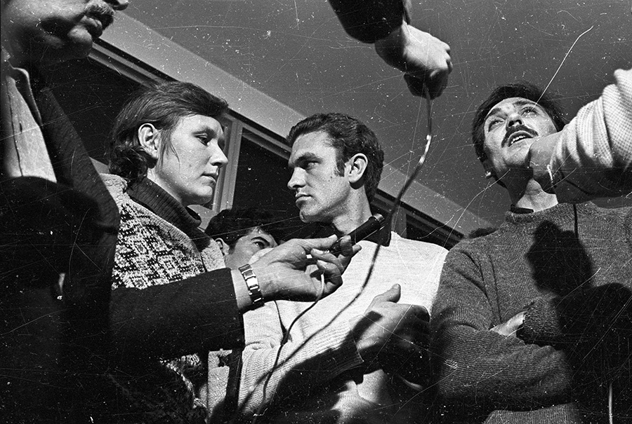 Los 19 integrantes de organizaciones político militar evadidos del penal de Rawson explican la motivación del plan de fuga frente a la prensa y a los numerosos pasajeros que quedaron demorados en el aeropuerto. De izquierda a derecha, detrás de los dos primeros María Antonia Berger con cuello de camisa negro Mariano Pujadas, Rubén Pedro Bonet y el periodista de CANAL 3 Daniel Carreras. 15 de Agosto de 1972. Provincia del Chubut. Aeropuerto de Trelew.