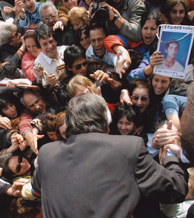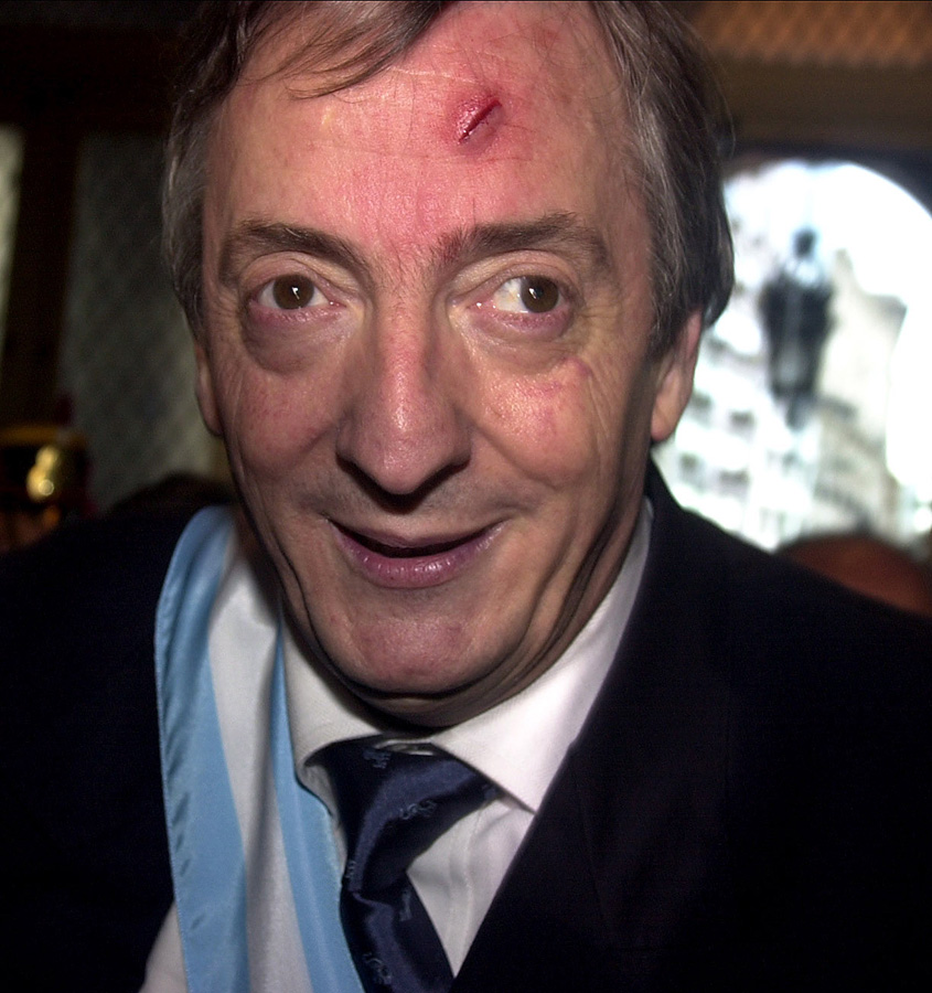 Después de la jura como Presidente de la Nación, Néstor Kirchner recibe un golpe en la frente de una cámara de TV en medio de una marea humana que lo acompañó hasta la explanada de Casa de Gobierno, 25 de mayo de 2003.