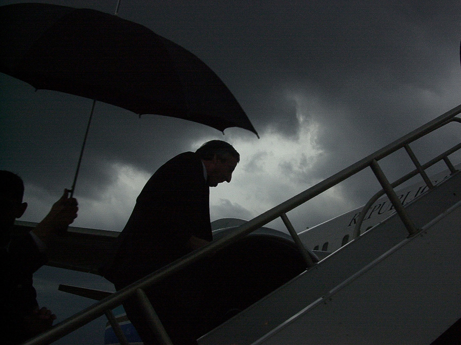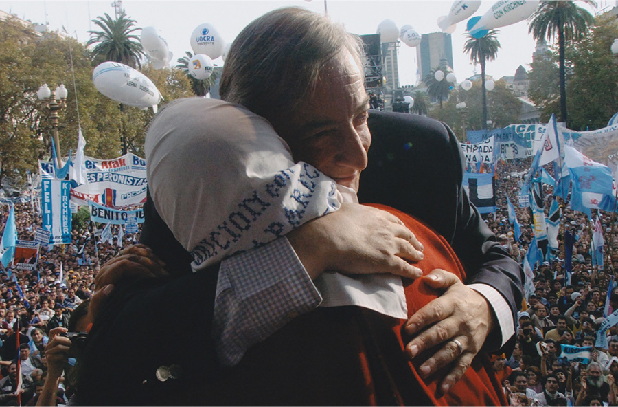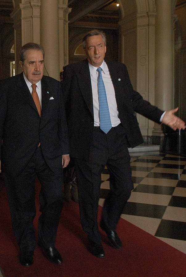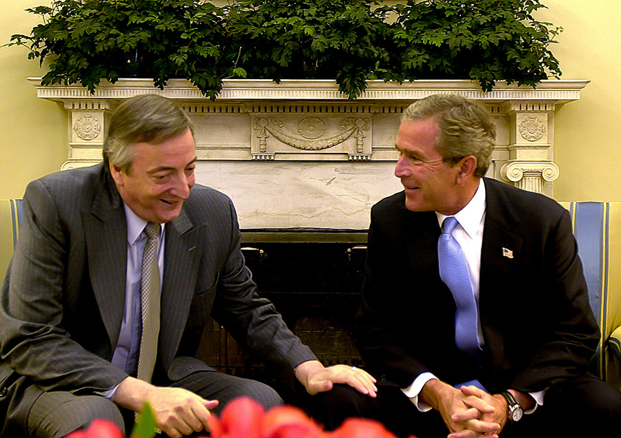 En el salón oval de la Casa Blanca el presidente Néstor Kirchner pone la mano en la rodilla del entonces presidente George W. Bush; replicando el mismo gesto que dos años antes Bush tuvo con el presidente radical, Fernando De La Rúa. Víctor Bugge fue el autor de ambas fotos, Néstor había observado detenidamente aquella imagen de su antecesor y fue intencional repetir el gesto como indicio de que la relación política con Estados Unidos sería diferente, julio de 2003.