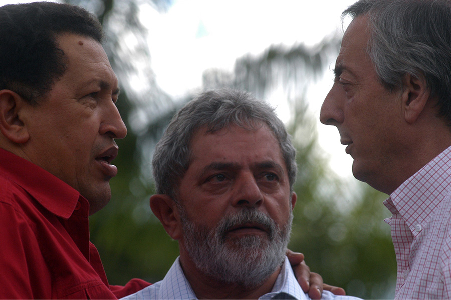 Encuentro de Hugo Chávez, Lula Da Silva y Néstor Kirchner en la residencia del presidente brasileño, tres de los líderes de la región latinoamericana que estuvieron dispuestos a fortalecer “La Patria grande”, 2009.