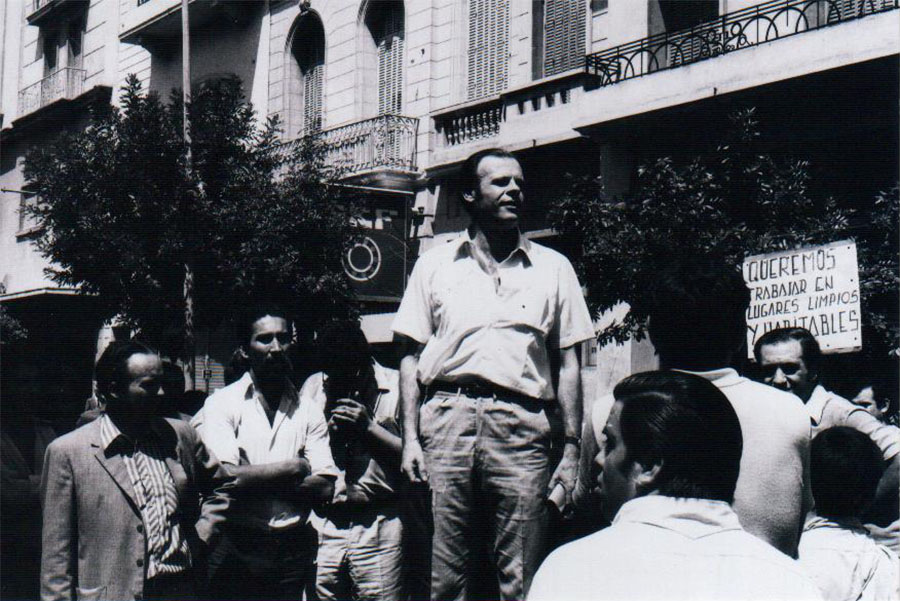 Era la sede del Sindicato un edificio construido con el aporte extra de los trabajadores, bajo el escrupuloso control de gastos supervisados por Tosco. Un lugar lleno de vida, siempre desbordado de obreros y estudiantes. Allí se caldeaban las inquietudes por renovar ideas, estéticas, disciplinas de lucha, sueños de transformación de la sociedad. Conviene apuntar que, en esa época, el diez por ciento de los setenta mil estudiantes en las Universidades de Córdoba, eran trabajadores en el sector industrial y afines. En el Salón de Actos, conferenciantes de distintos sitios del país llenaban el recinto de jóvenes ávidos de pensamientos modernos y rebeldía. Tosco alentaba esos encuentros masivos y participaba en circunstancias excepcionales como en una que recuerdo ahora. Iba a dar su conferencia un afamado periodista cuyo vuelo desde Buenos Aires no llegaba a tiempo. Los organizadores, estudiantes de la Facultad de Ciencias de la Información, subieron a la cuarta planta al despacho de Tosco donde estábamos reunidos. Le plantearon la situación de la sala llena sin la presencia del ponente: