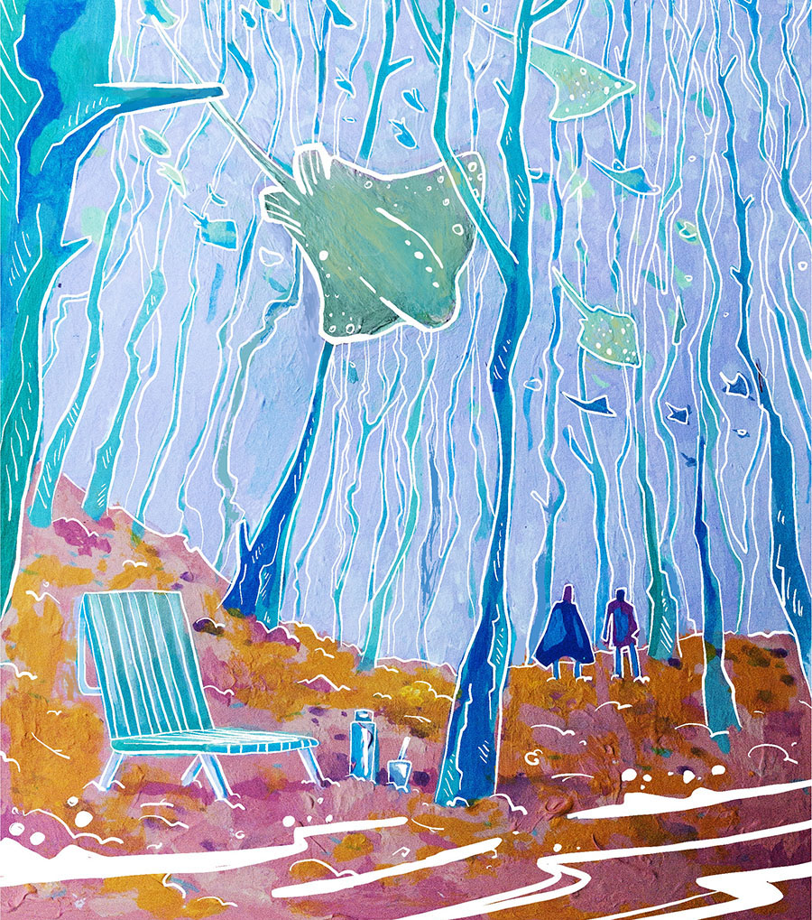 Los remolcadores rodean la nave, son cuatro puntos cardinales guiando los movimientos. Felipe clava los ojos en el fondo del océano, donde solían estar los árboles más altos del mundo. Entonces le viene el recuerdo, un día de calor, una tarde de alguno de esos veranos que duraban años. Inés en malla entera, floreada en tonos multicolor. Los dos sentados en la costa, hechos milanesa, ella explicándole su teoría del bosque hundido en el agua.