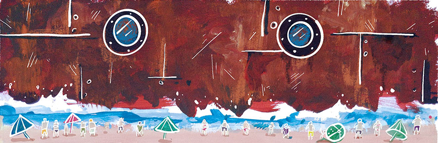 Felipe se levanta de la reposera, camina descalzo hasta que la ola le llega a los tobillos. Los rulos se dispersan en todas las direcciones. Un olor intenso lo aturde, hay cajones flotando en la superficie, van apareciendo entre las burbujas como la pasta que se cocina el domingo al mediodía. Los langostinos se desprenden, se multiplican, ya no están empaquetados para la venta. El contacto con el agua los hincha como globitos, como si toda la masa flotante fuese el fruto de un mundo subacuático que se desintegra. La orilla se tiñe de rojo, el mar ha cambiado de color.