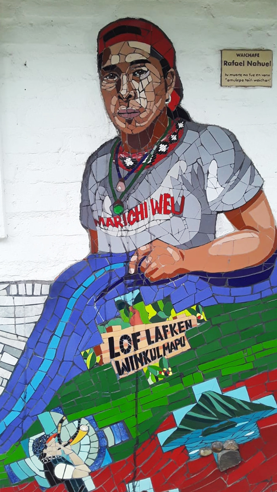 Fragmento del mural del colectivo Mosaico Urgente en COOPETEL (Cooperativa telefónica de El Bolson), Plaza Pagano, El Bolson, Río Negro, 2020.