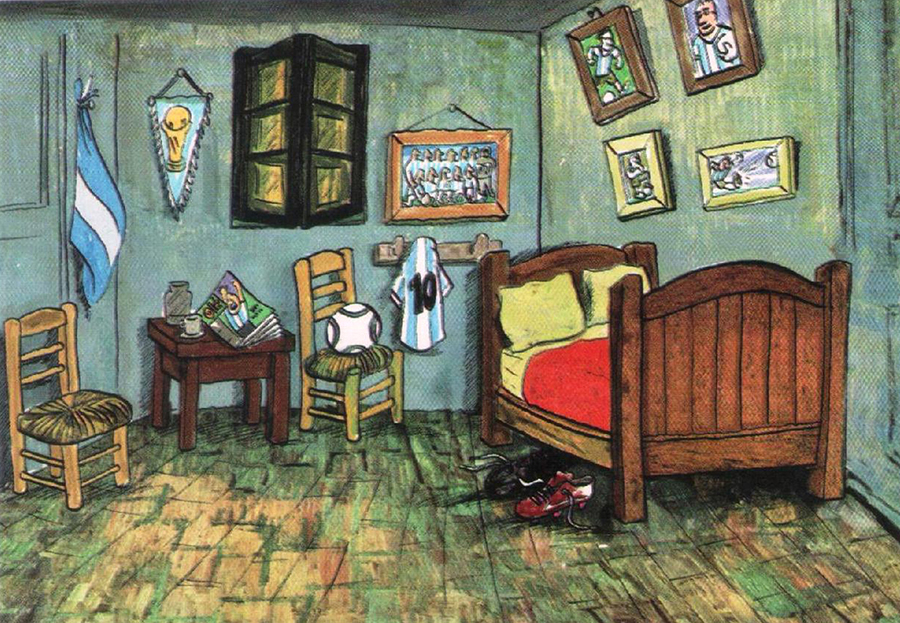 La habitación... futbolizada. Ilustración de Eduardo Maicas en 100 x 100 mundiales. Postales de las copas de Juan José Panno. Bs. As. Editorial Colihue. 2014.