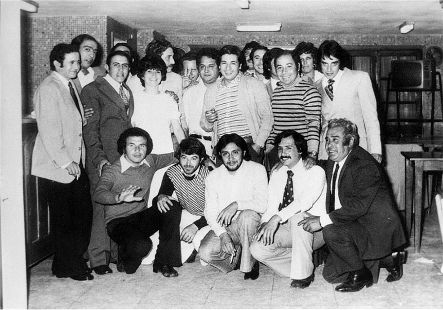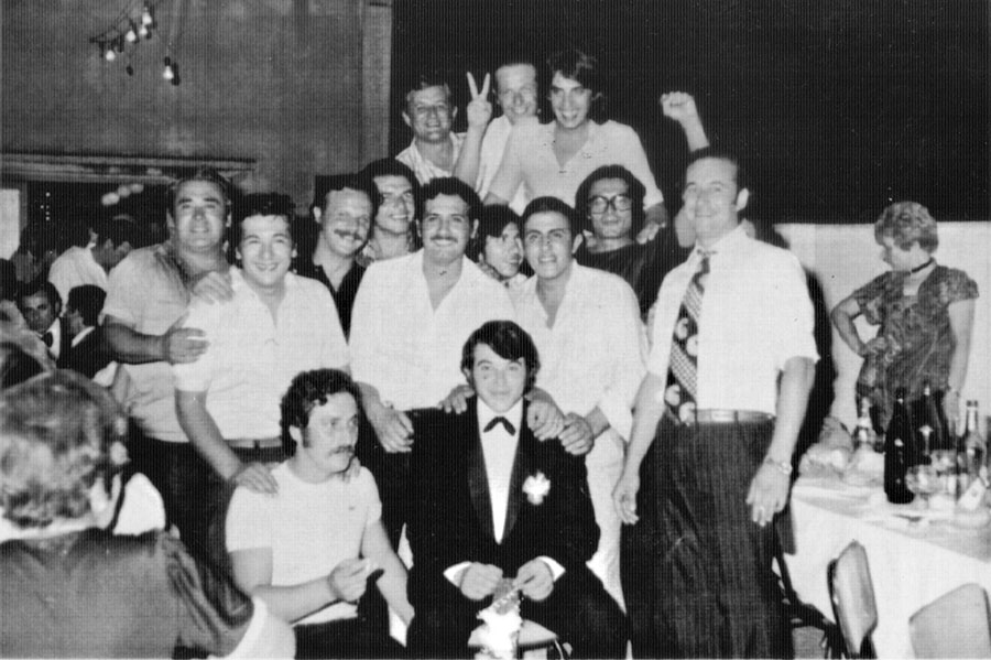 El casamiento del “Tano” Mastinu. Están casi todos sus compañeros. El “Chango” Sosa, de anteojos y con el puño en alto, “Carlito”, de pie, con la camisa arremangada y sus manos sobre los hombros del “Guerri”, Livio Garay. “Jaimito”, Luis Benencio, aparece haciendo la “V”. En primer plano, de corbata, el “Gallego” Valberde, primer miembros de la agrupación asesinado. Todos muy jóvenes, la foto muestra los distintos espacios de socialización de los trabajadores. Foto: Archivo Federico Lorenz