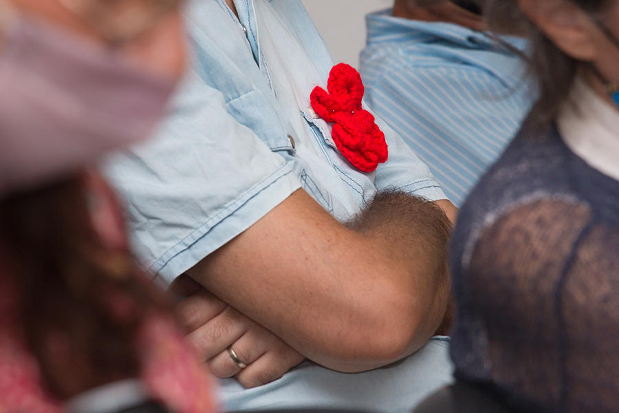 La rosa tejida a mano es un símbolo de este juicio. Las hizo Irma Ortolani, de 92 años, madre de Susana Brardinelli, sobreviviente y esposa de Armando Croatto. TOFC N°4, San Martín, Buenos Aires, 2021. Foto: Natalia Bernades/El Diario del Juicio