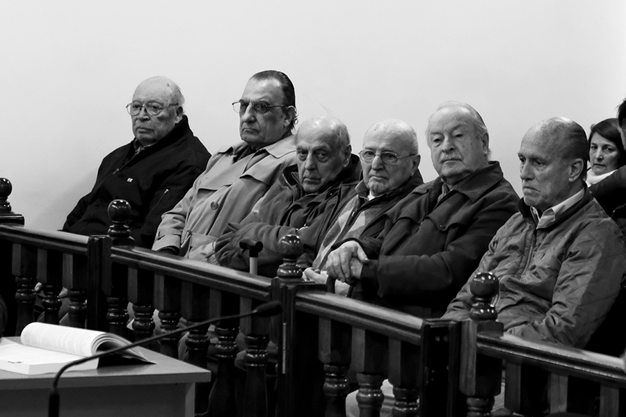 De izq. a der.: Jorge Bano, Jorge Norberto Apa, Raúl Muñoz (murió durante el juicio), Roberto Dambrosi y Marcelo Cinto Courtaux. Falta Luis Firpo, ahora preso por violar la domiciliaria. TOFC N°4, San Martín, Buenos Aires, 2019.Foto: Gustavo Molfino/El Diario del Juicio