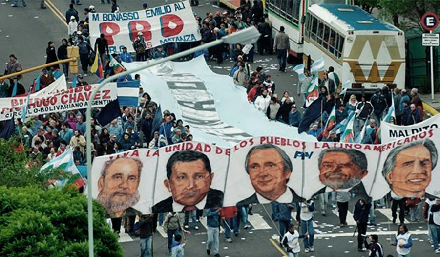 Poco después, en Argentina se desata el conflicto con las patronales agropecuarias, que mantuvo en vilo el recientemente asumido gobierno de Cristina Fernández de Kirchner. El caso empieza a admitir lecturas en clave regional. Los gobiernos populares y progresistas asisten a confrontaciones veladas o abiertas con podres concentrados locales. América Latina despertaba y los nombres del amanecer todavía ensayaban monólogos inspirados, pero a tientas. Uno de esos días de marzo, llega al suplemento Radar de Página/12 un libro sobre Bolívar. No parecía casual, a simple vista, que un nombre fuerte de la historia latinoamericana, que empezaba a connotar nuevas resonancias políticas, tomara la forma de un libro impreso. Podía haber sido una edición popular estatal pregonada desde la Caracas vibrante de un tiempo de oro bolivariano, pero aún esta frecuencia transmitía a bastante distancia, y mucho menos irradiaba sobre una zona intelectual universitaria local de fuste. Es decir, se hablaba poco de Chávez y Bolívar en la universidad argentina, menos aún del proceso latinoamericano como un conjunto articulado o como una marca de época, aunque una serie de acontecimientos habían comenzado a hilvanar narraciones y perspectivas en ámbitos militantes y en algunas oficinas públicas. Para algunos, las jornadas contra el proyecto del ALCA en la Cumbre de las Américas en Mar del Plata, y el tren que unió personajes y geografías como Maradona, Kusturica y Evo, podía formar parte de un folklore político lateral. Y aquellos momentos en el estadio mundialista saltando bajo la lluvia contra el libre comercio digitado por el imperio, mientras que en el Hotel Provincial cuatro o cinco presidentes mosqueteros plantaban bandera en soledad, pero de manera decidida, cortés y valiente, en la cara de Bush, para otros podían resultar un acting tribunero. Sin embargo, de a poco la región iba trazando nuevas costuras, retomaba caminos, afinaba instrumentos y despertaba entusiasmos.