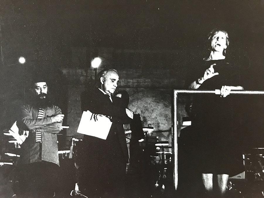 Concierto de la Sinfónica de Roma, despedida del exilio. En la foto Lita hablando al público, en el medio el intendente comunista de Roma y más atrás el cineasta Fernando Birri, 1983. Foto: Archivo familiar