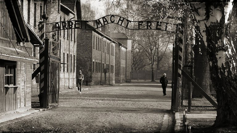 Auschwitz. En la reja que atraviesa la calle se traduce “EL TRABAJO TE LIBERA” Foto: Galería del Holocausto.