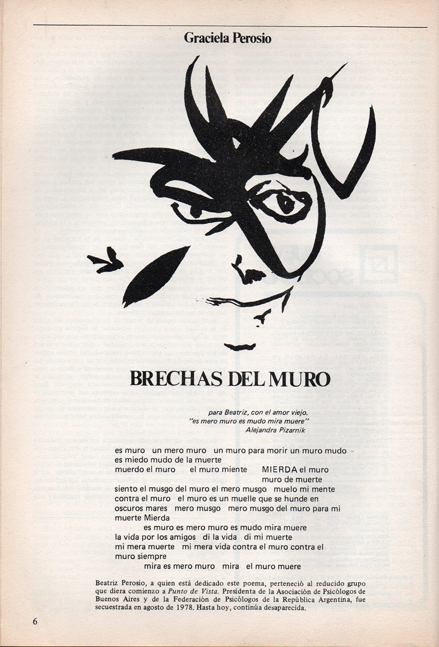 Beatríz Leonor Perosio fue secuestrada el 8 de agosto de 1978. Un año antes había asumido como Presidenta de la Asociación de Psicólogos de Buenos Aires (APBA) y de la Federación de Psicólogos de la República Argentina (FePRA). Tenía 31 años. Cada 8 de agosto -desde 2009- la Federación conmemora el Día Nacional del Psicólogo Víctima del Terrorismo de Estado en Argentina. Compartimos para esta ocasión un poema -que es también la historia de su escritura- de la crítica, poeta y docente Graciela Perosio, su hermana menor.