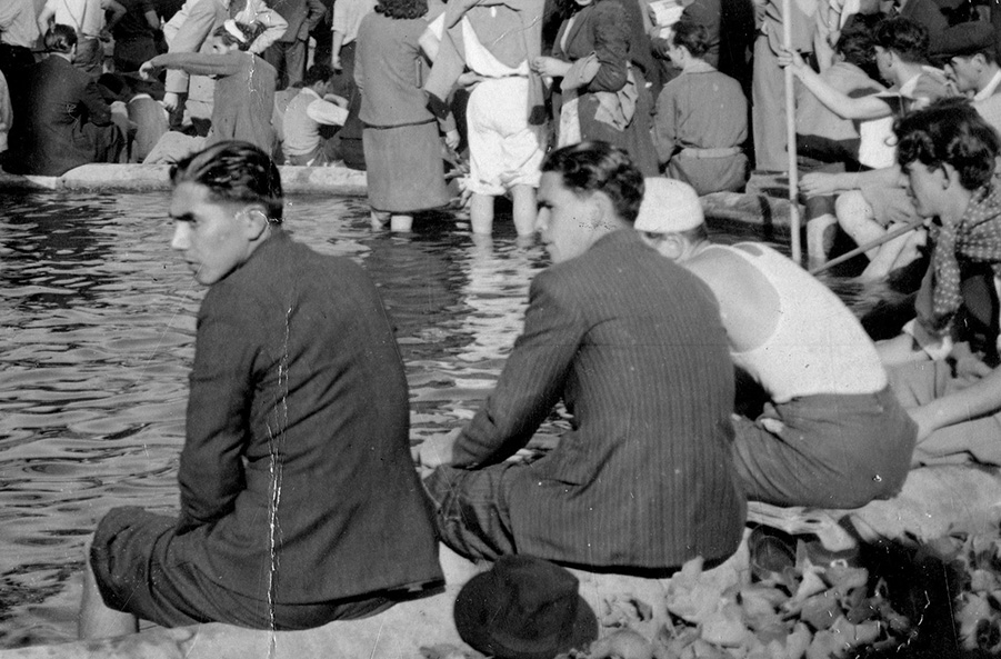 Juan Molina y su hermano están sentados al borde de la fuente en Plaza de Mayo. Ambos con saco oscuro, gomina, pantalones arremangados, pies en el agua. En el medio de los dos, se ve el sombrero de uno de ellos. Juan trabajaba en una fábrica de gaseosas, pero ese día no fue, su hermano le dijo que “había que ir a rescatar a Perón”. Se tomaron el tren en Caseros hasta Palermo y desde ahí caminaron hasta Plaza de Mayo. Juan usaba calzado ortopédico, la caminata desde Palermo fue agotadora. Hacía demasiado calor ese 17 de octubre de 1945.