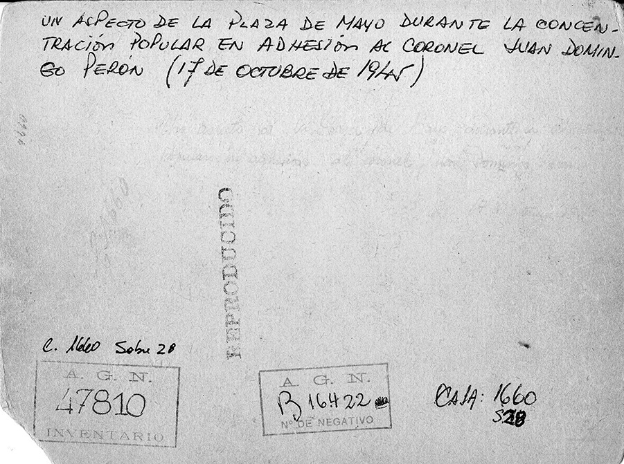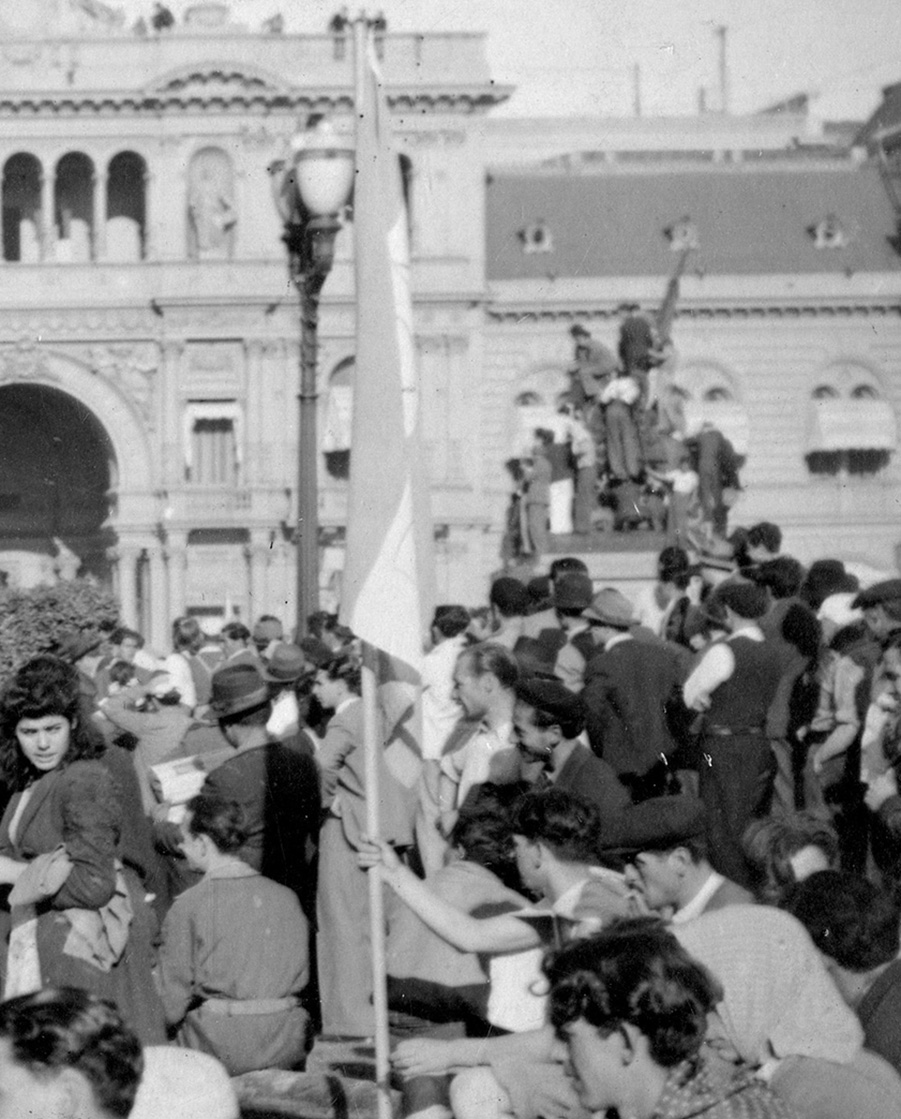 La importancia histórica y fundacional que tendría esta fotografía no podía estar en la imaginación de quienes la protagonizaron. Los y las manifestantes que vemos en ella habían ido a apoyar a Perón, a pedir su libertad. Lo hacían de manera pacífica, no se ven escenas de lucha, ni simbología obrera ni resistencia a la autoridad. No es una manifestación en el sentido clásico del término, es gente esperando algo. La policía –sabemos– ese día dejó que la multitud se expresara con tranquilidad.