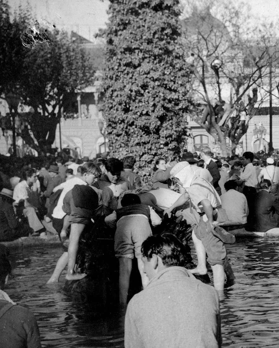 El 17 de octubre de 1945 quedó cristalizado en la fotografía que llamamos “las patas en la fuente”. Muestra una escena en la fuente que ya no está y tiene la Casa Rosada como telón de fondo. Es de autoría anónima, quedó conservada en el Archivo General de la Nación y fue tomada alrededor de las cinco de la tarde. El escenario, la Plaza de Mayo, rodeada de los edificios emblemáticos del poder político, religioso y económico en la Argentina. Una zona casi sagrada y de uso exclusivo para la élite de los años 40.