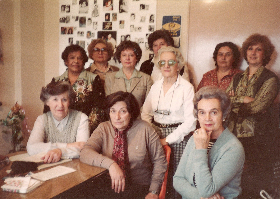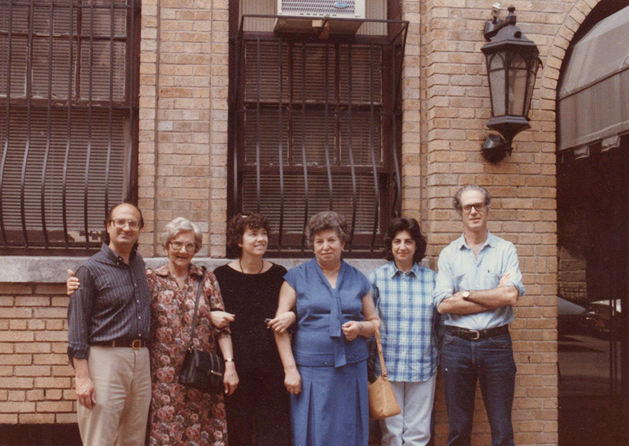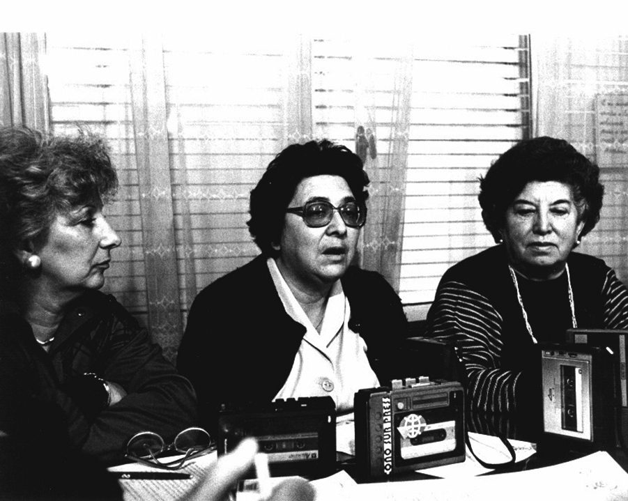 Las abuelas Licha De la Cuadra y Chicha Mariani posan junto a Víctor Penchaszadeh (derecha) y otros colaboradores. Todavía faltaba un año para la creación del BNDG, pero la justicia argentina ya había admitido como prueba la realización de análisis genéticos, a partir del caso de la nieta Paula Eva Logares. Nueva York, 1986. Fuente: BNDG