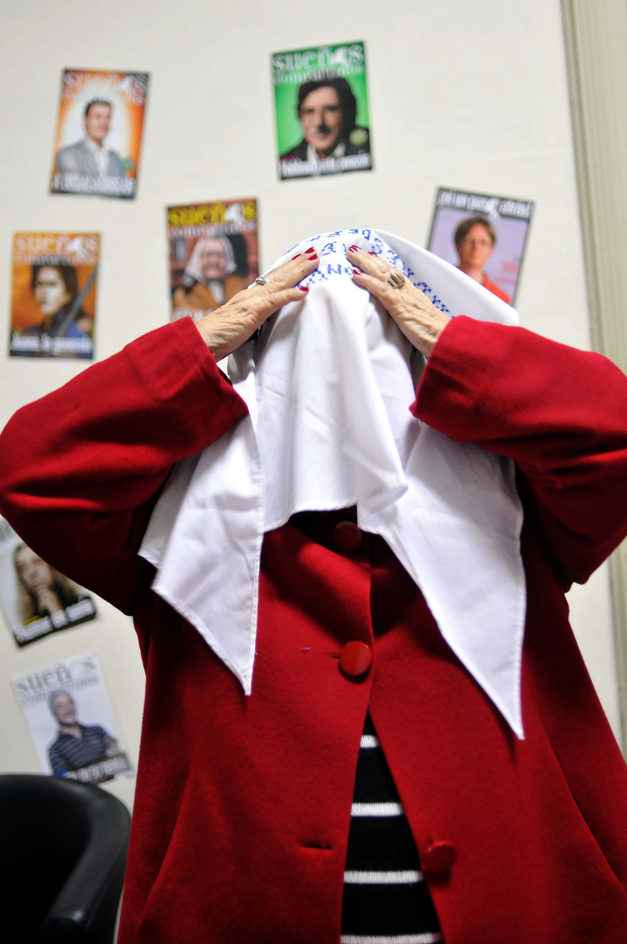 Hebe de Bonafini poniéndose el pañuelo blanco de la Madres. Foto: Eva Cabrera
