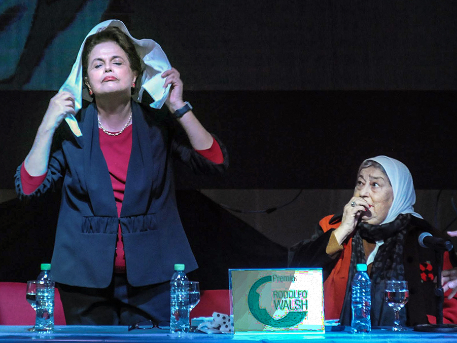En la entrega de premios de Rodolfo Walsh le otorgaron a Dilma Rousseff el pañuelo de las madres bordado con punto cruz, a su lado, Hebe de Bonafini la mira atentamente. Foto: Eva Cabrera