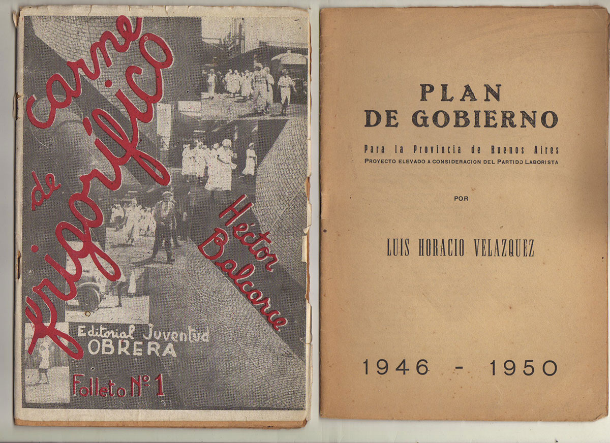 Izq.:Folleto Carne de frigorífico, firmado bajo el seudónimo Héctor Balcarce. Der.:Plan de gobierno para la Provincia de Buenos Aires, 1946-1950, proyecto elevado para consideración del Partido Laborista por L.H. Velázquez.