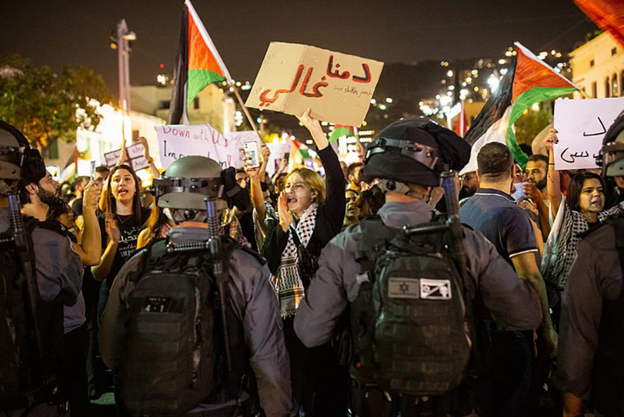 Ciudadanas y ciudadanos palestinos reclaman por haber sido expulsados de un barrio en Jerusalén por civiles apoyados por las fuerzas armadas israelíes. 2021 Foto: palestinalibre.org. Fuente: https://www.cels.org.ar