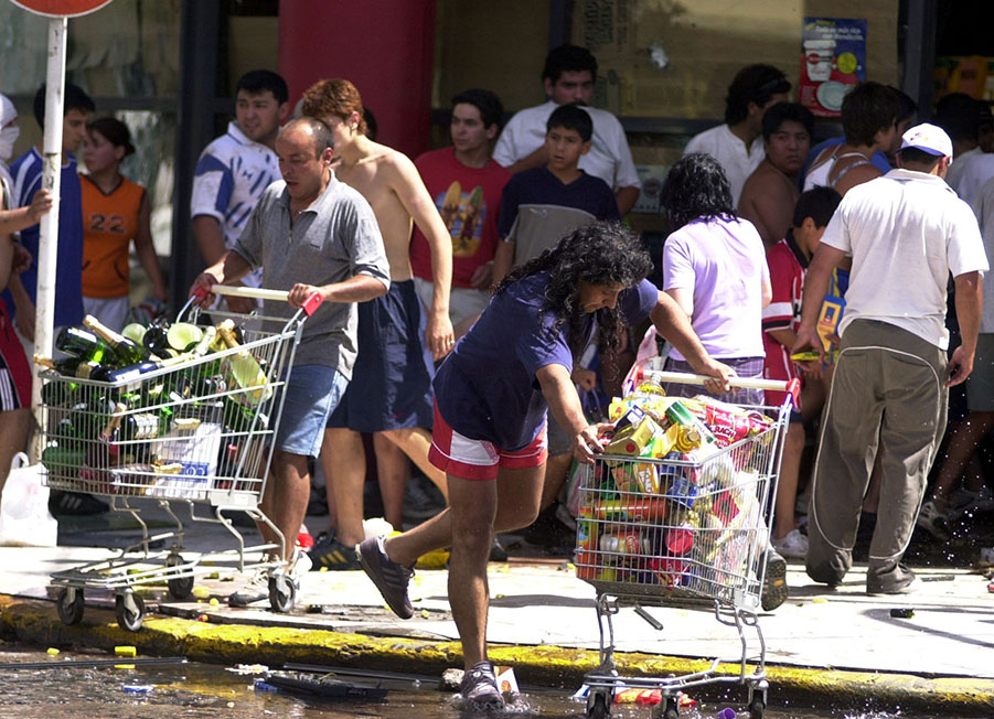 Adrede referimos a este protagonismo oscuro, porque apenas revisar las intervenciones que se sucedieron en los meses inmediatamente posteriores a diciembre de 2001, salta a la vista que fue lo que principalmente quedó en penumbras, fuera del radar, y sólo por semejante omisión emerge subrayado. Al grano: no se habla de los saqueos como parte del acontecimiento político que aún tiembla. Pero incluso con esta falla muchas de esas intervenciones son bárbaras, sacan chispas, vibran en la incomodidad ante un material, un hecho, que no ha dejado de ocurrir y se les resiste. Pelos arrancados, espaldas transpiradas, anteojos rotos. Nicolás Casullo, por ejemplo, en la entrevista que le hace María Moreno y se publica el lunes 4 de marzo de 2002 en Página 12, condensa su lectura de la situación en una escena que casi recién lo había perturbado desde la televisión: “Vi como una bella mujer, gritando por sus dólares en la city, increpaba a un movilero de Todo Noticias y le refregaba en la cara, en vivo y en directo, la historia de Clarín, Canal 13, Radio Mitre y Torneos y Competencias.” Se adueña del micrófono y acusa a todos de ser una “mierda”, para la consternación del “pobre chico”, el movilero, que pasmado no reacciona y “teme perder el empleo.” La mujer en cuestión es una “Santa Juana de los dólares” o “de los countries“, que se atreve a decir lo que dice porque es “de la misma ‘clase’ que la viuda de Noble.” A lo Pasolini en la coyuntura del ‘68, el afecto y la solidaridad de Casullo están con el movilero, un trabajador. Aunque ni una pizca de entusiasmo le genera ese “movimiento de damnificados” y no “oprimidos” –de este modo diferencia Alejandro Kaufman en otra conversación con María Moreno, el 28 de enero-, el tono con que Casullo narra y se retuerce además de preocupación trasluce buen humor, desparpajo, cerca de la alegría. Es cierto que, en su lectura, no es esto sólo lo que despertó en las jornadas del 2001; son también los estudiantes que lo corren por izquierda y lo descolocan por primera vez desde que da clases en la UBA. Ahora bien, ni palabra sobre la movilización persistente de las franjas más empobrecidas de la población, de ciudades tan distantes como Mendoza y Concordia, que merodearon alrededor de los supermercados desde los primeros días del último mes de ese año. Ni siquiera son telón de fondo, como si no se calibrara políticamente su actuación.