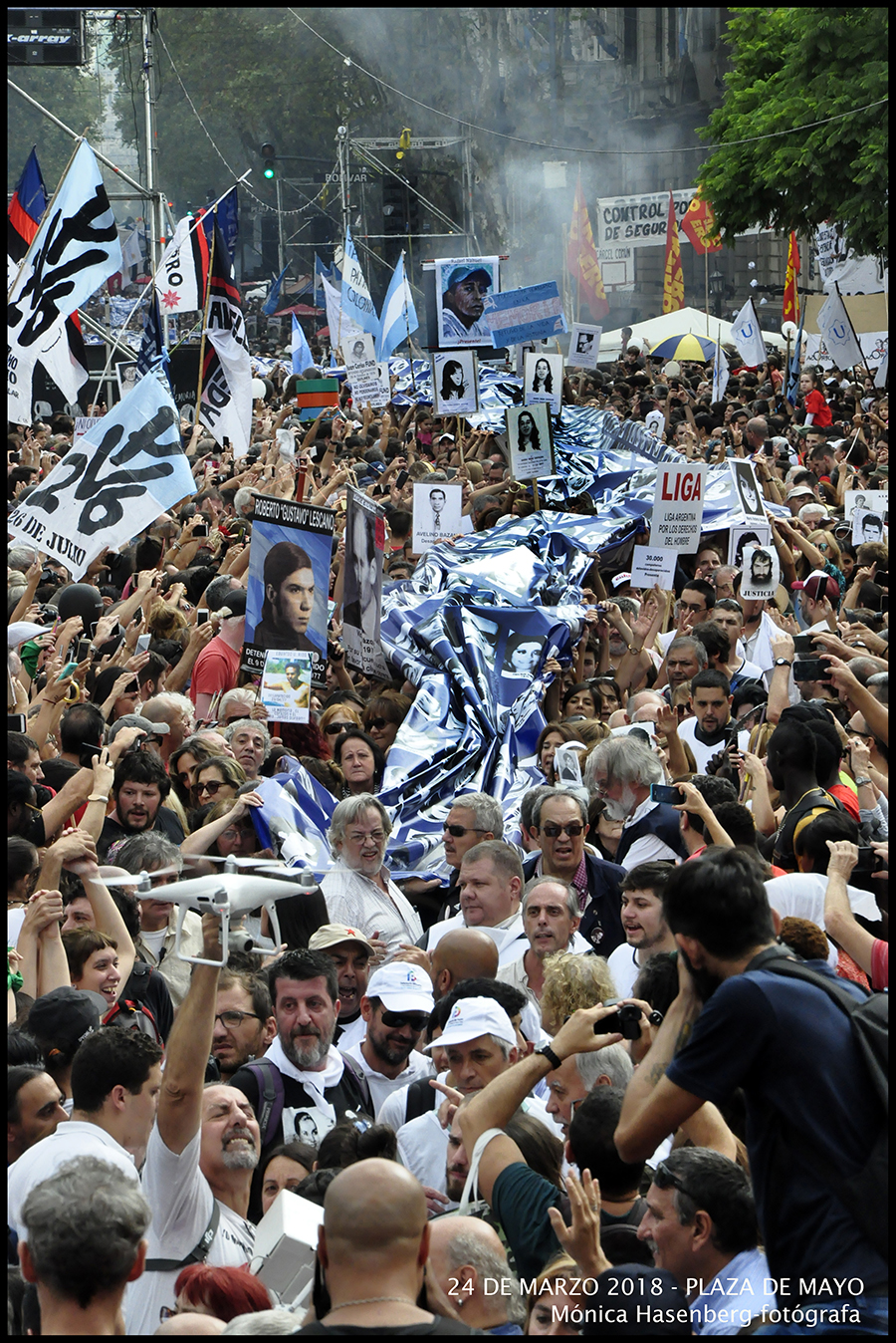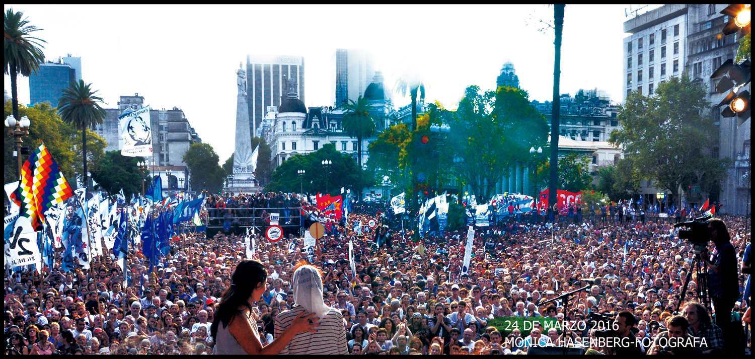 Mónica Hasenberg fotografió decenas de movilizaciones del 24 de marzo a Plaza de Mayo. En este ensayo, sus imágenes elegidas en la víspera de un nuevo aniversario del golpe de Estado de 1976. “Desde el escenario –afirma-, la Plaza se ve como una síntesis conmovedora de quienes sentimos un amor profundo por nuestro país, por nuestra Matria-Patria”.
