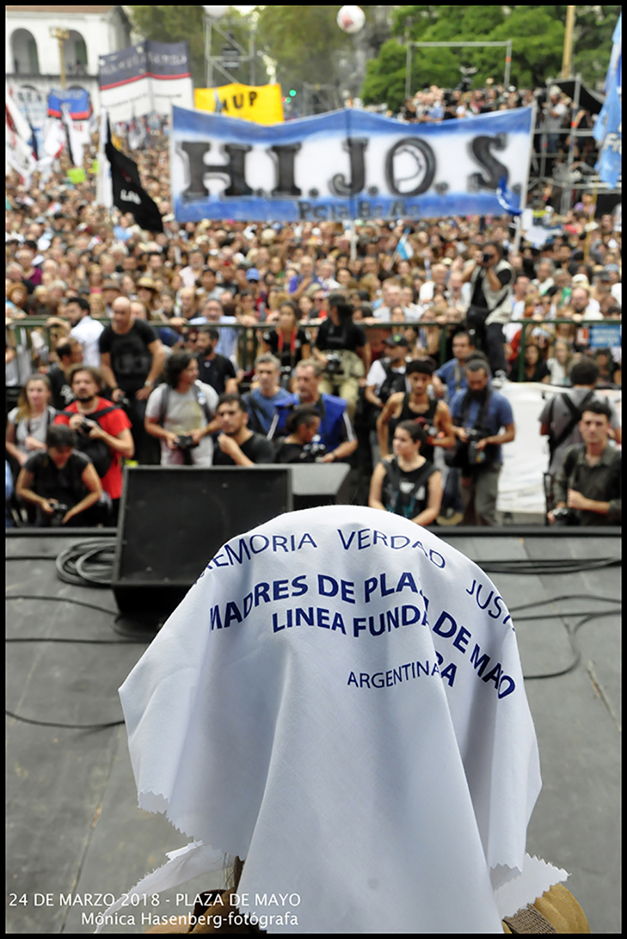 Madres desde el escenario frente a una multitud que acompaña la conmemoración. H.I.J.O.S. presente, 24 de Marzo, 2018. Foto: Mónica Hasenberg