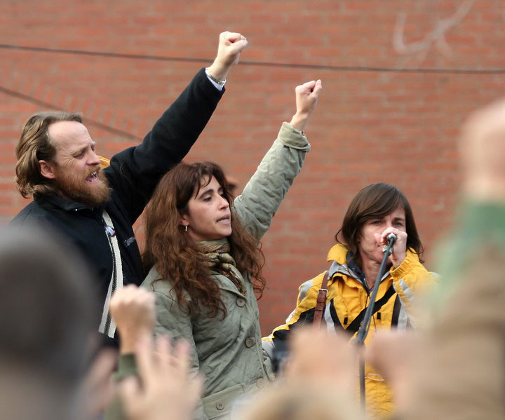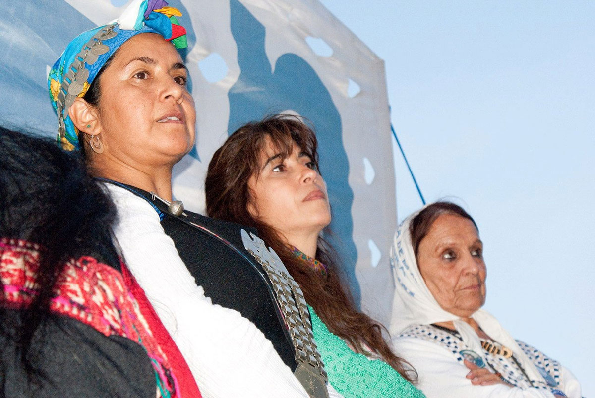 Dirigente de pueblos originarios junto a Sandra y Taty Almeida, Madre de Plaza de Mayo en una movilización en reclamo de Justicia.