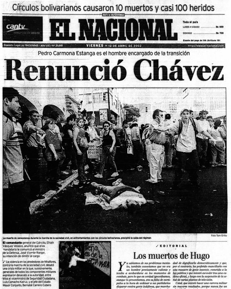 La historia latinoamericana hasta abril de 2002 enseñaba que, una vez derrocado el presidente, su destino era la muerte (Salvador Allende, Chile 1973), la prisión (Estela Martínez de Perón, Argentina 1976) o el exilio (Joao Goulart, Brasil 1964), sólo para mencionar algunos ejemplos de la larga lista de golpes cívico-militares. Por ese motivo, todos quienes apoyaron el golpe lo celebraron abiertamente sin ningún tipo de pudor, convencidos de que la historia se repetiría. A nadie se le cruzó por la cabeza que podía fracasar el derrocamiento de Chávez porque, además, contaban con el apoyo de la televisión, la radio, los diarios y -no menos importante- el guiño de Washington. Y su odio hacia Chávez los intoxicó con su propia propaganda creyendo que toda Venezuela se levantaría contra el presidente.