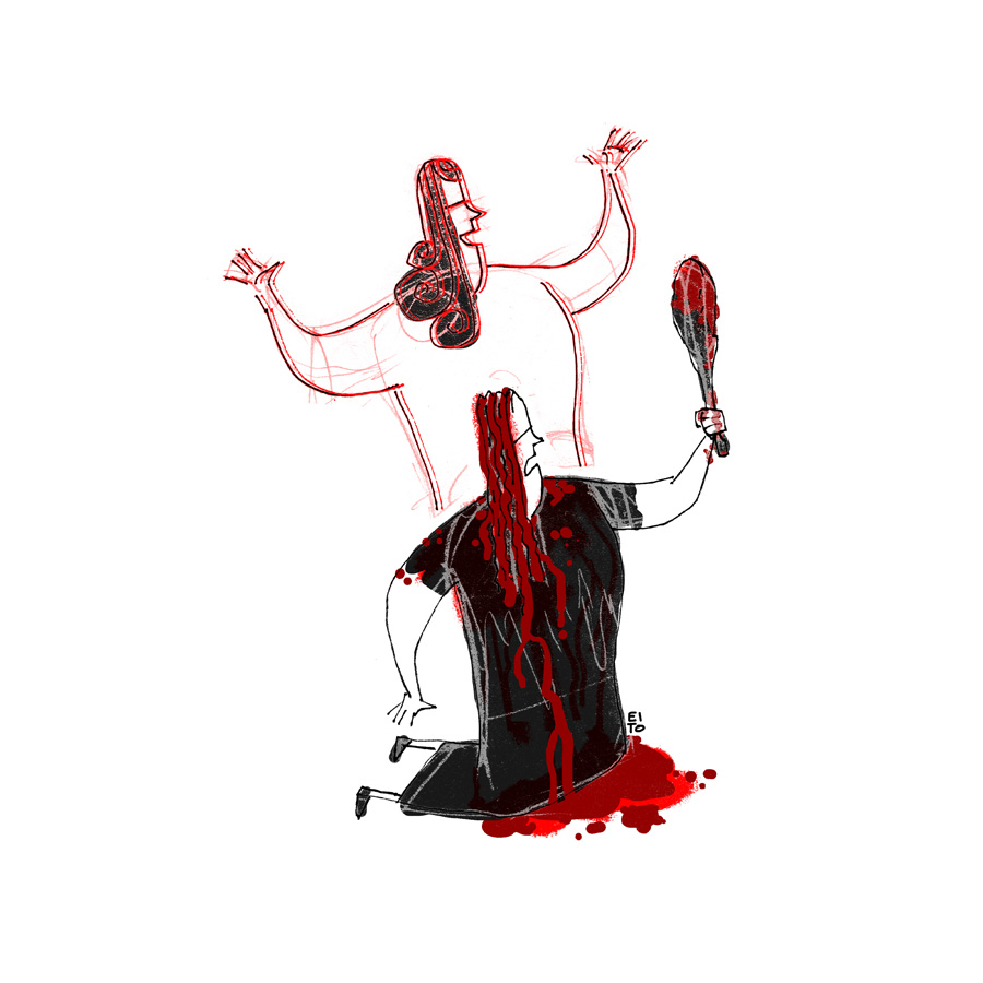 S.P. no cabía en sí de goce entonando alabanzas a la creación toda y por atribuir este milagro al uso del garrote, cuando decaía su fe o las oraciones se atascaban en la garganta, con exaltado fervor usaba sobre sí misma (sobre su sesera para ser exactos) el terrible instrumento. Como es común entre las gentes notaron el cambio operado en S.P. no faltando los que unidos para censurar el ejemplo de una conducta incomprensible necia y boba por demás, dejaron al olvido toda educación pasada (anterior de esta extravagante moda del garrotón). ¿Es posible desechar a la ligera la personalidad individual (única prueba de nuestra existencia en estos mundos)?, comentaban escandalizados que la Eternidad es una droga para quienes practican su conocimiento, estorbo e insulto feroz y pretención maligna contra aquellos (ellos) que teniendo sus dos ambas patitas bien puestas sobre el cemento se resignaban por temor a este destino. Y esa falta de respeto con sus congéneres al hablar de animales árboles estrellas como si esas patrañas fueran barrera de distinción con el resto. Pues alguien recuerda o ve estas cosas en la Ciudad, ¿dónde se ocultan? Si esto es malo mucho peor agregaban es nombrar las cosas que decididamente no existen: alma, garrotazo, sangre, sacrificio, alegría, hipnosis, enseñanza de la esperanza… Sucede que está semi idiota y completamente loca de tanto aboyarse y perder sangre. Las multitudes hostilizantes crecían mientras S.P. aguardaba preparándose con valor para el inevitable martirio y Gloria por los siglos de los siglos Amén. Pero nada de eso; le quitaron el garrote; le prohibieron el aboye; le dieron muerte a su muerte inmortal su muerte sacra; suspendieron todo sacrificio. Eso sí al alma no la tocaron, con el alma no se metieron los muy demonios porque no la creían. Y el alma pidió socorro a los cielos y los cielos se la enviaron. Un hermoso ángel posó su varita mágica en la santa coca destrozada de P. que de inmediato ascendió atravesando los 32 pisos de la cárcel que celosamente la guardaba. Ascendiendo tal cual estaba. Y siguió…